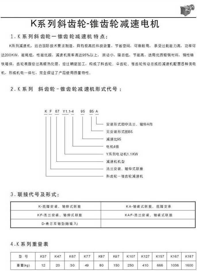 K系列斜齒輪-錐齒輪減速機(jī)特點(diǎn)型號表示法聯(lián)結(jié)代號及形式重量表