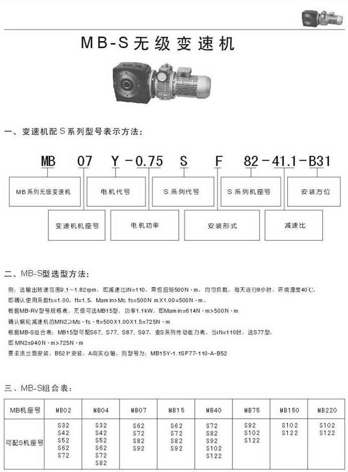MB-S無(wú)級(jí)變速機(jī)型號(hào)表示法選型方法MB-S組合表