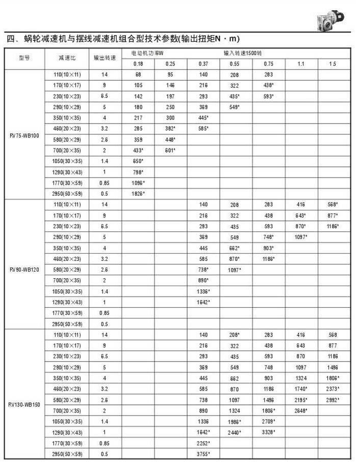 蝸輪減速機與擺線減速機組合型技術參數(shù)表(輸出扭矩N.M)二